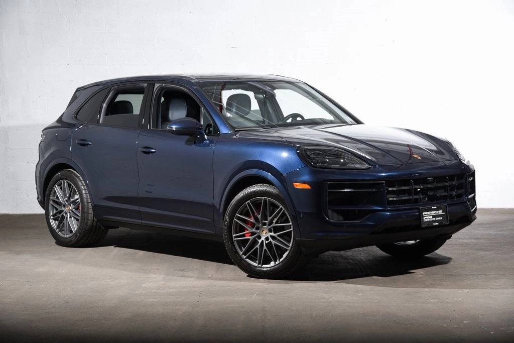 Certified. Algarve Blue Metallic 2025 Porsche Cayenne 4D Sport Utility S AWD 8-Speed Automatic with Tiptronic V8 Black w/Leather Seat Trim w/Leather Interior.